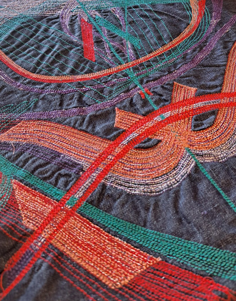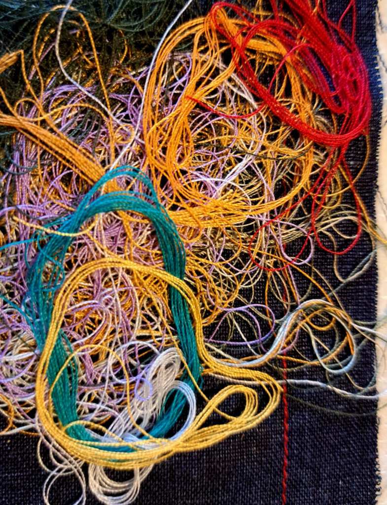 First I tried the hand embroidery then I used sewing machine to create sewed network of different colourful threads. The sewed textile network shows 95 overlapping graded lines featuring the shoe upper pattern of a women’ boots.