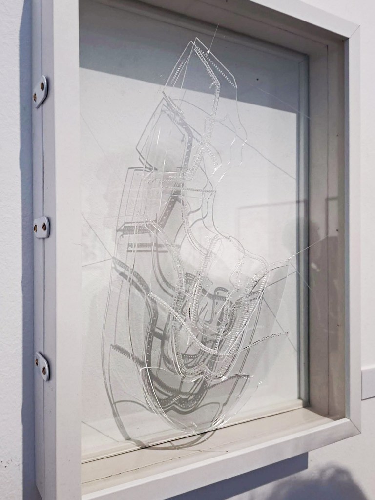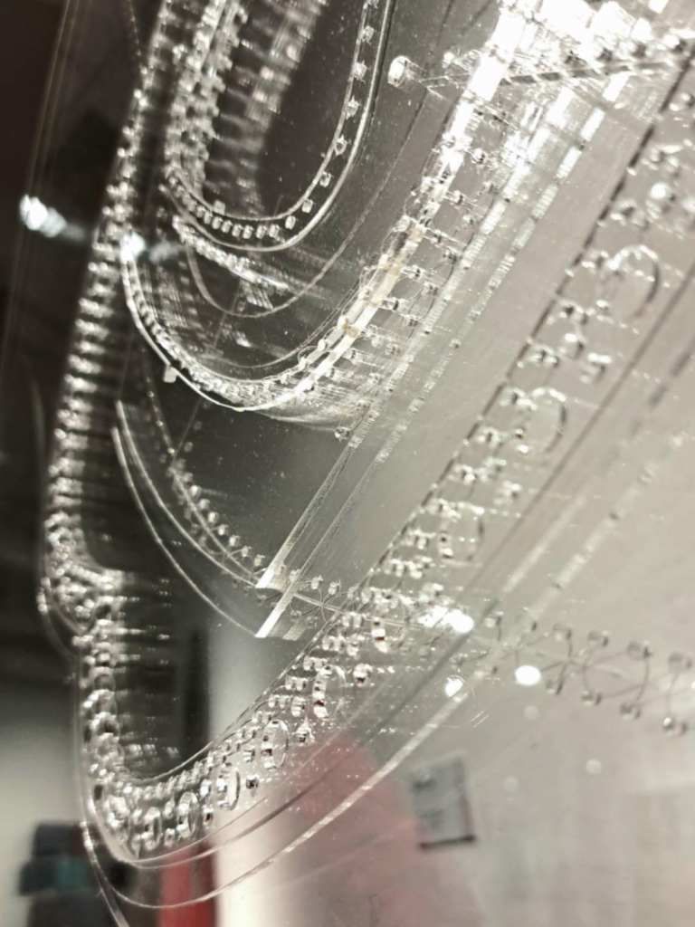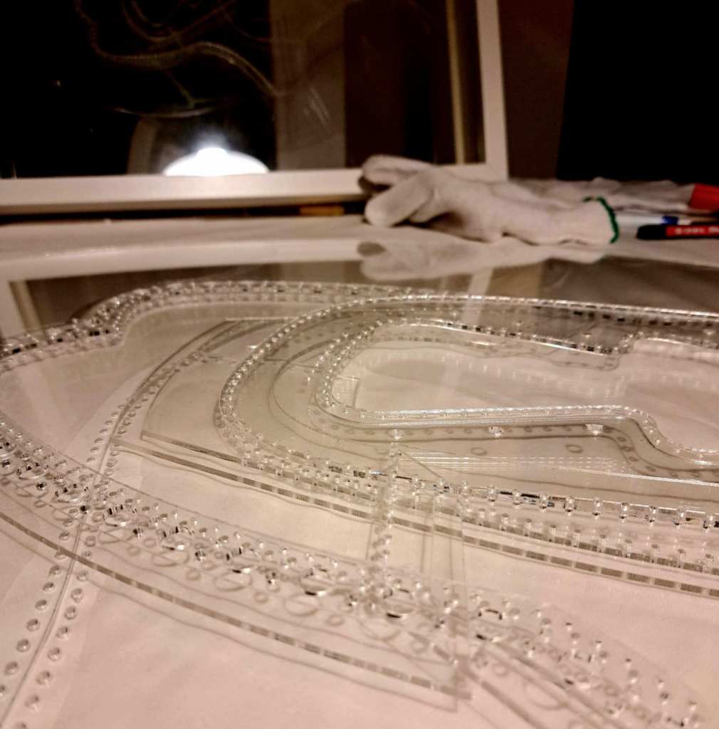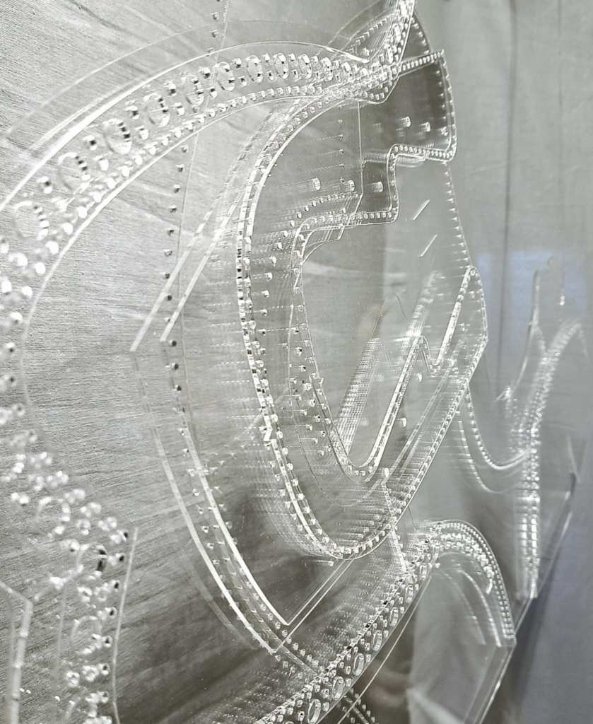 A tribute to the Beauty of the shoe industry’s engineering work | Spatial objects | embroidery and plexiglass objects inspired by shoe pattern editing process