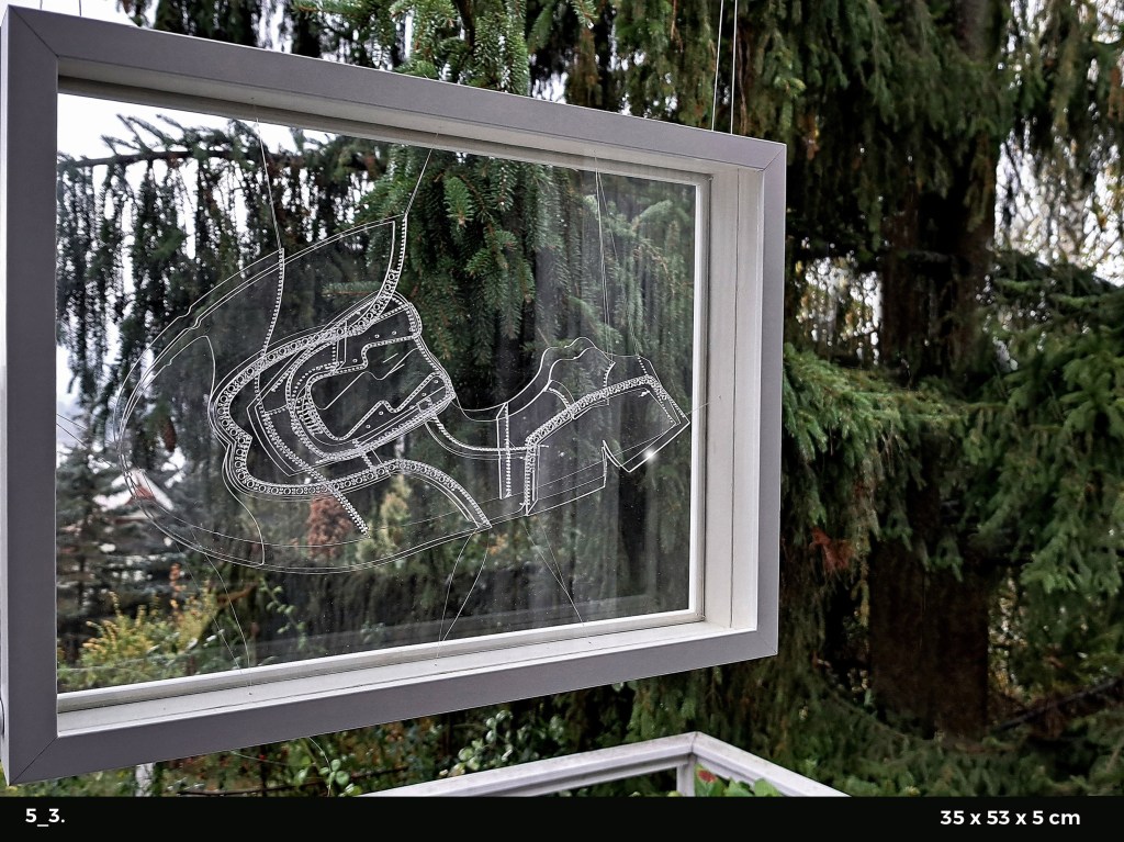 Afterwards I step forward this experimental milestone and came to the final decision for the best result. I chose the plexiglass material. I adjusted the different parts in layered structure sewed by hand with an invisible nylon wire. I could keep the proper edges of fitting the layers with the help of this solid material. The plexiglass spatial artwork shows the shoe upper patterns of 18 overlapping parts featuring a full-brogues oxford style sneakers’ design in 1:1 / 37 EU size proportions ( 30 x 40 x 2 cm ), and also in 3:1 magnification of the real size ( 109 cm x 70 x 6 cm ).