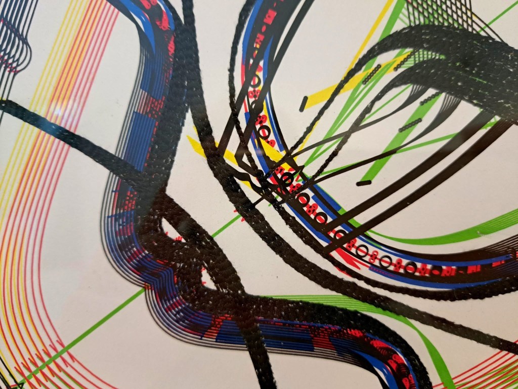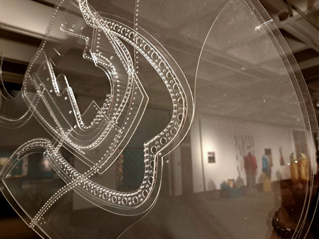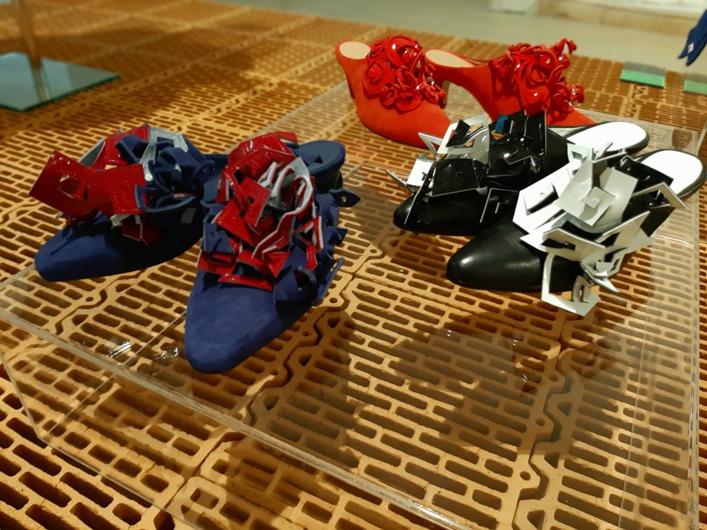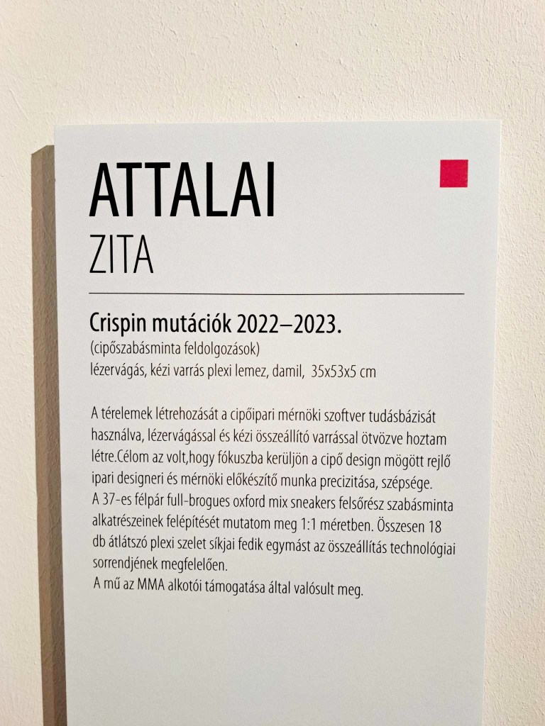 I presented some of my experimental autonome works at this exhibition. My aim is to express the beauty of the shoe industry’s engineering work by creating a visualization of the digital pattern editing process. The shoe industry production development turns out in digital platforms and I objectified the aesthetic view which I see on the computer screen during the pattern editing works. The plexiglass spatial artwork shows the shoe patterns of 18 overlapping parts featuring the full-brogues oxford style sneakers. The object’s size is 3:1 magnification of its actual EU 37 size. Beyond this I presented a Miniature textile artwork where 95 lines of the pattern parts overlap each other and fulfill the canvas sheet with differend coloured threads. The coloured threads cross over each other on the canvas sheet creating an interesting landscape.