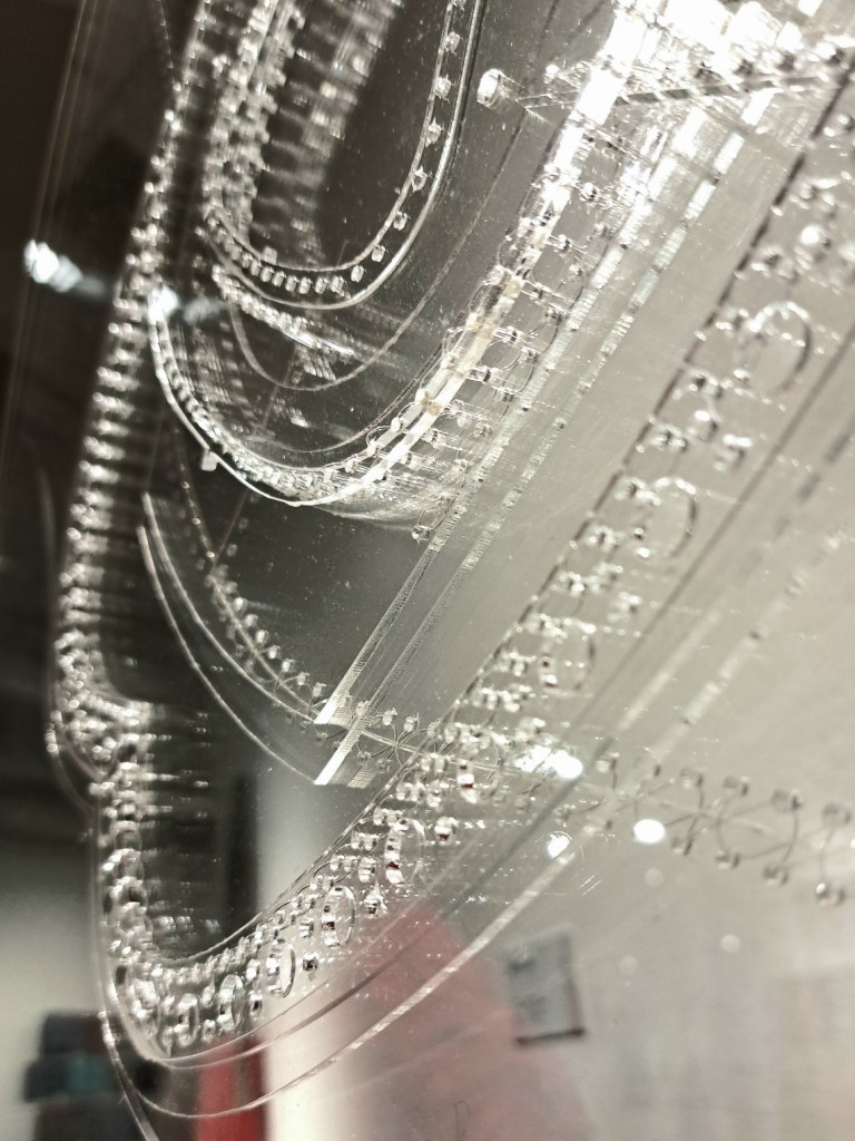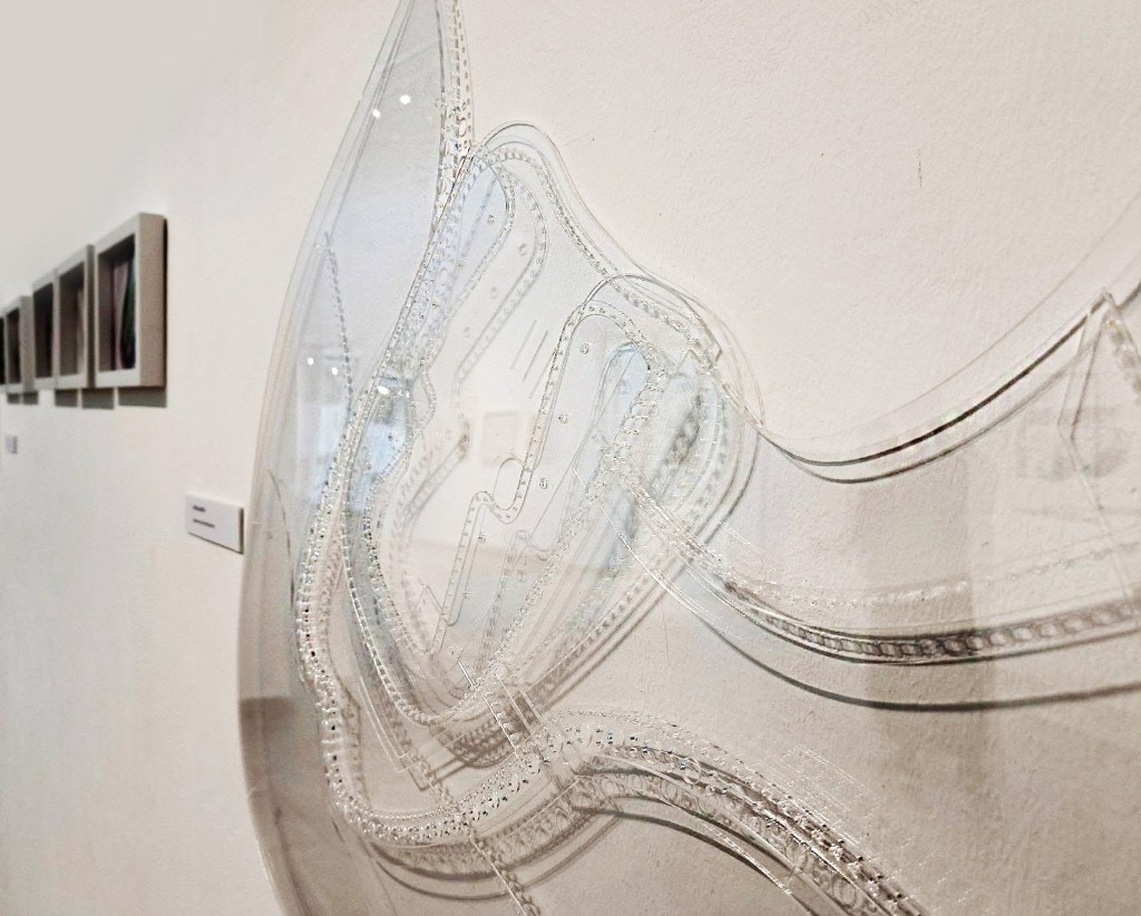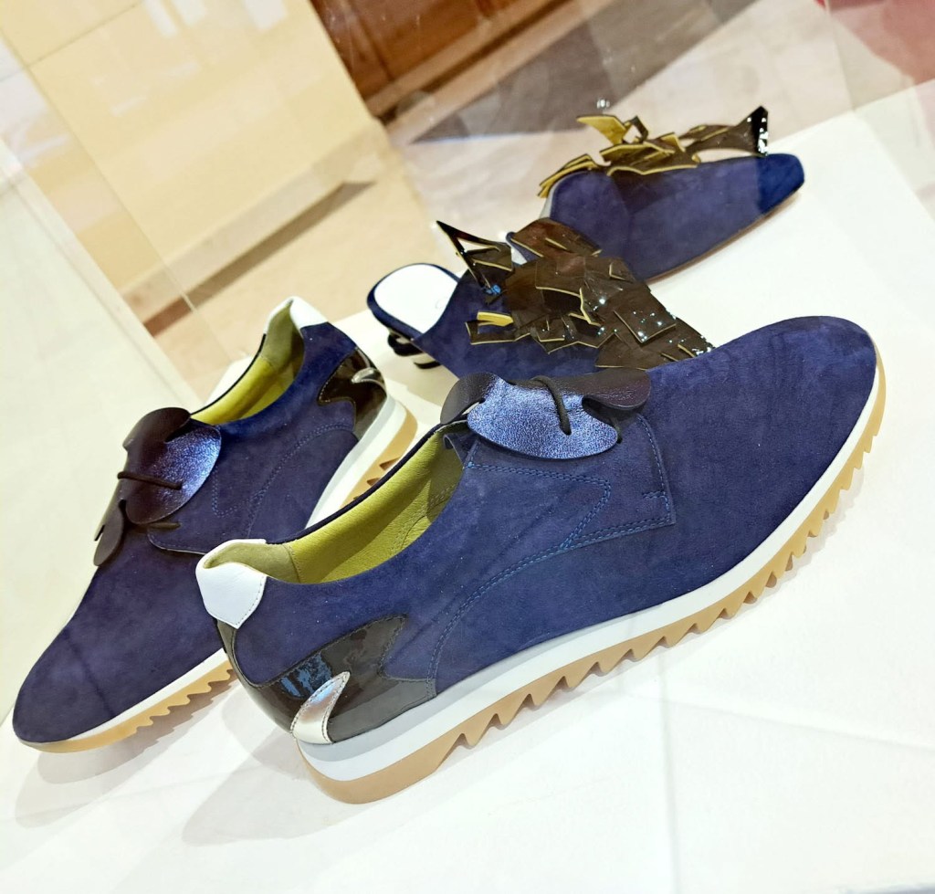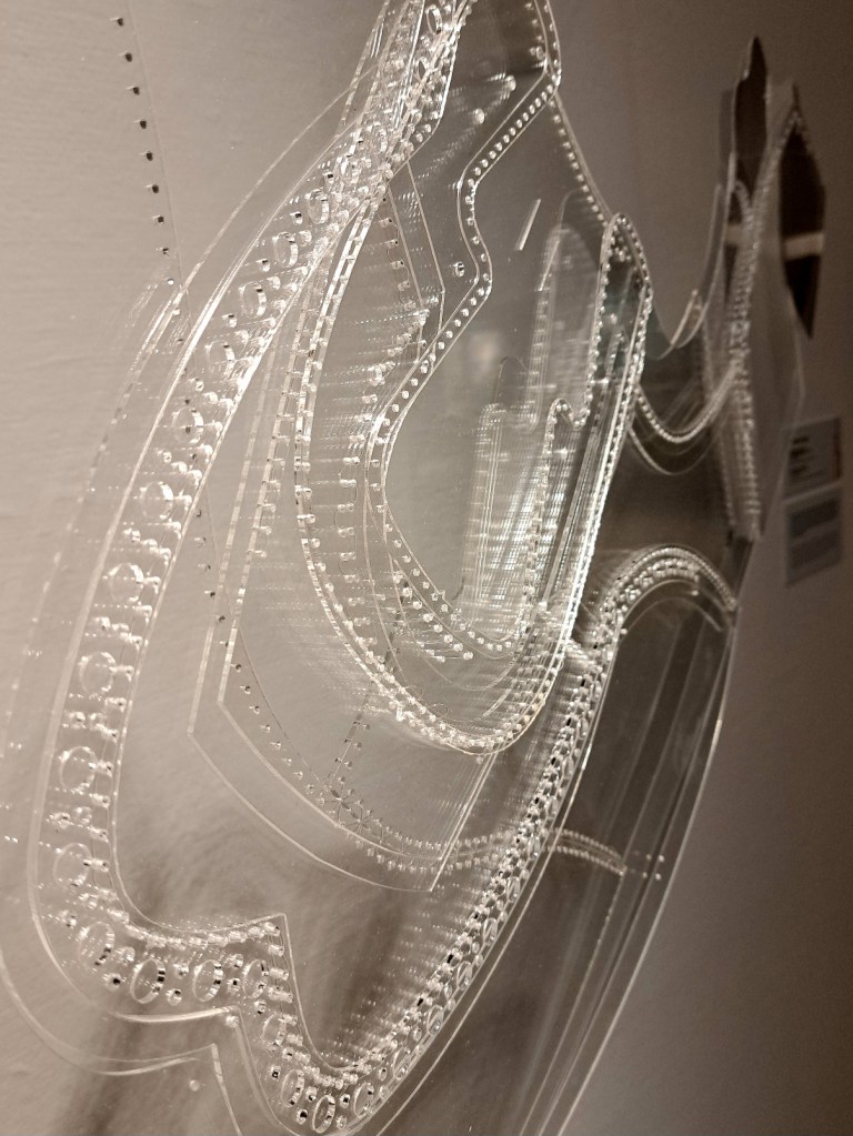 I presented some of my experimental autonome works at this exhibition. My aim is to express the beauty of the shoe industry’s engineering work by creating a visualization of the digital pattern editing process. The shoe industry production development turns out in digital platforms and I objectified the aesthetic view which I see on the computer screen during the pattern editing works. The lines of 95 pattern parts overlap each other and fulfill the canvas sheet with differend coloured threads. The plexiglass spatial artwork shows the shoe patterns of 18 overlapping parts featuring the full-brogues oxford style sneakers.