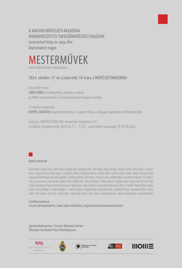 MESTERMŰVEK 2024 | Collective exhibition of contemporary applied arts of Hungarian artists | Szentendre MűvészetMalom Ferenczy Museum Center 09.10.2024. – 02.12.2024. curated by: Judit Tankó, Ida Lencsés, Attila Zsigmond artists